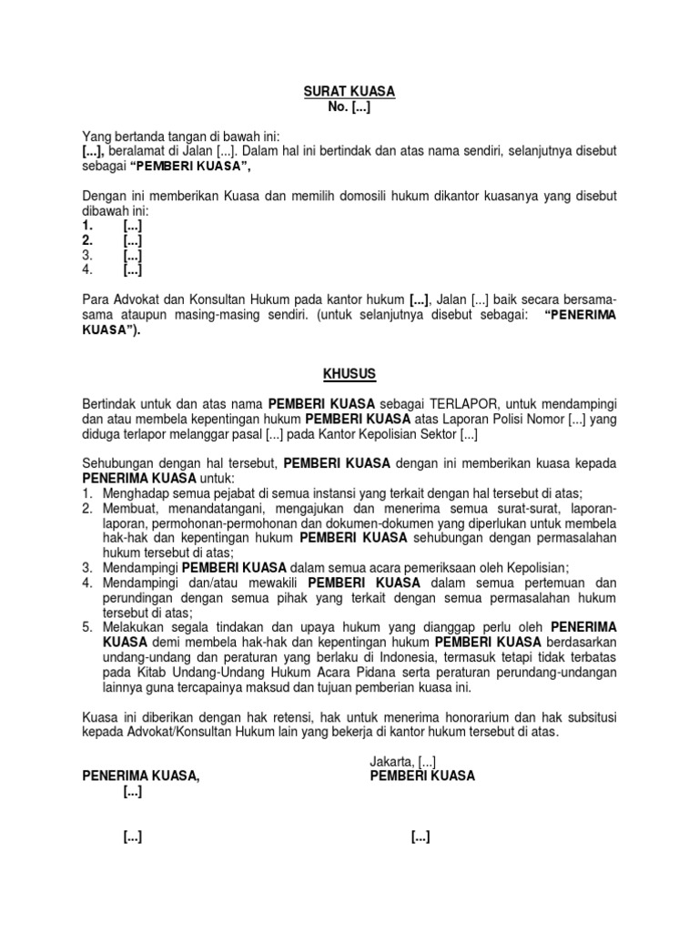 Salah satu perihal penting tersebut adalah mengurus. Sangat membantu saya alam menyelesaikan praktek pradlan pidana… saya ucapkan banyak terima kasih. Surat kuasa ini diberikan dengan hak retensi dan substitusi. Apabila anda hendak melakukan pindah kuasa dan belum mengerti pembuatannya, contoh dalam bagian ini, surat kuasa akan menjadi lebih jelas mengenai sifat dari surat kuasa tersebut, baik itu berupa surat kuasa umum atau surat kuasa khusus. Pada gambar contoh di atas surat kuasa khusus pidana tersebut di berikan oleh terdakwa yudi setiawan kepada empat pengacara yang berasal dari law office fidelangwarmasse & partners yang bertujuan untuk mengurus hal terkait dengan kasus dugaan korupsi yang di tujukan kepadanya.